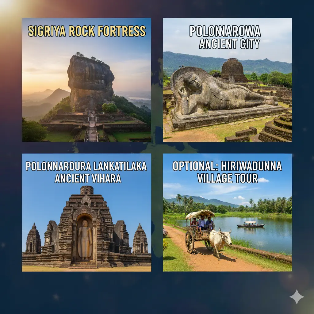 Sigiriya Rock Fortress β Built by King Kashyapa in the 5th century; famous for its frescoes, mirror wall, and the Lion Gate.