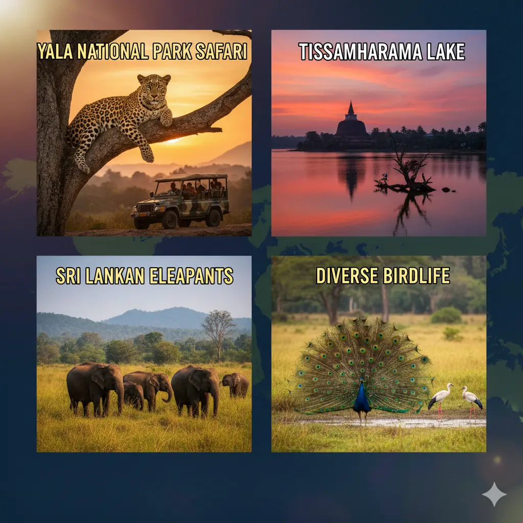Yala National Park Safari β Home to leopards, elephants, sloth bears, and over 200 bird species. Take a thrilling evening jeep safari.