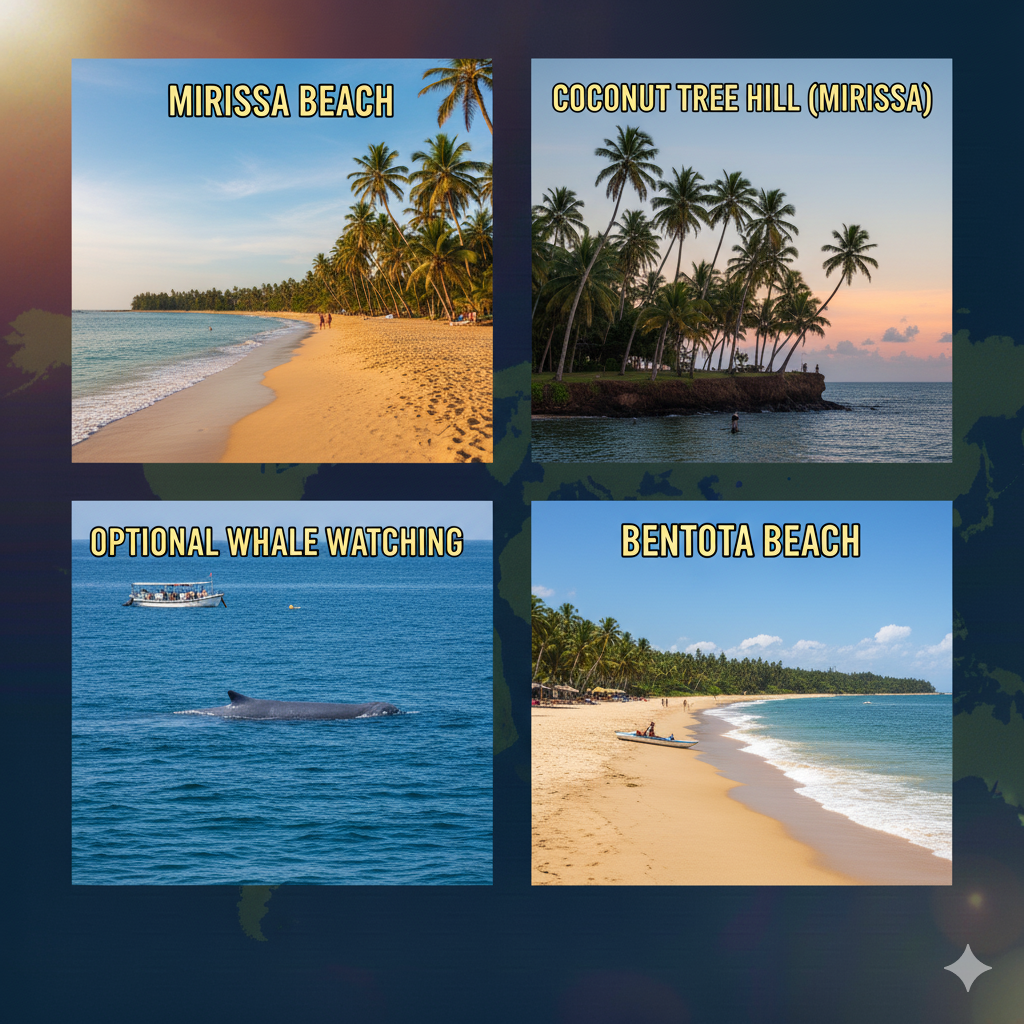 Mirissa Beach / Bentota Beach β Famous for golden sands and turquoise waters.