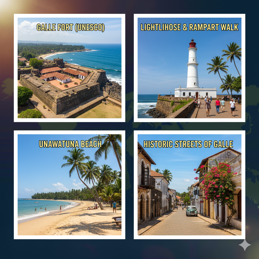 Galle Fort (UNESCO World Heritage Site) β Built by the Portuguese, expanded by the Dutch in the 17th century.