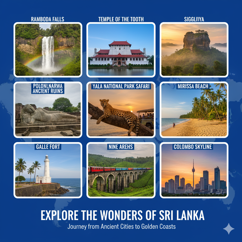 Negombo, Dambulla, Sigiriya, Pidurangala, Polonnaruwa, Matale, Temple of the Tooth Relic (Sri Dalada Maligawa), Nuwara Eliya, Ella, Nine Arches Bridge, Yala National Park, Tissamaharama, Mirissa, Bentota, Galle Fort, Unawatuna, Balapitiya, Kosgoda, Colombo City