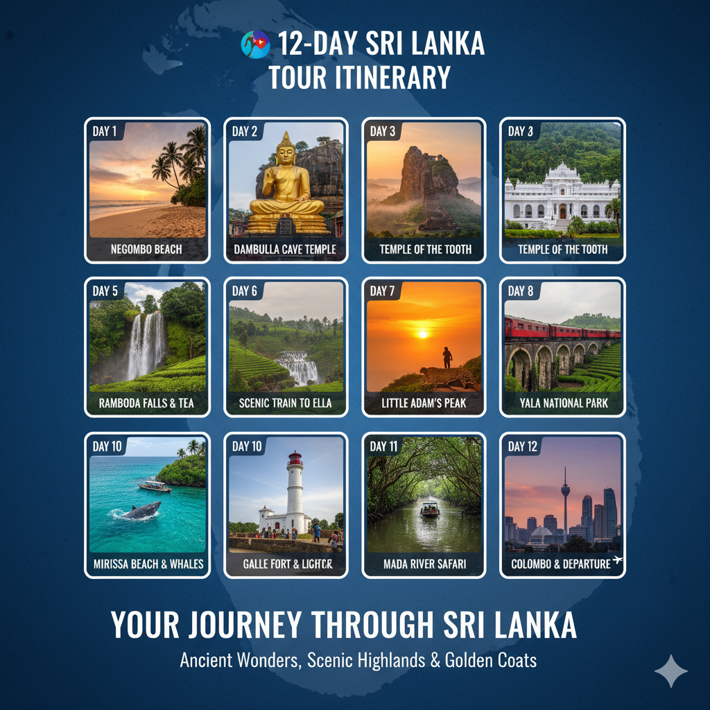 Experience the best of Sri Lanka in just 12 days β from ancient cities and misty tea hills to golden beaches and wildlife safaris.